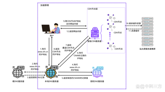 CDN的服务商在各地都有服务器群,可以解析DNS计算距离用户最近的服务器来获取缓存资源,以避免网络拥堵