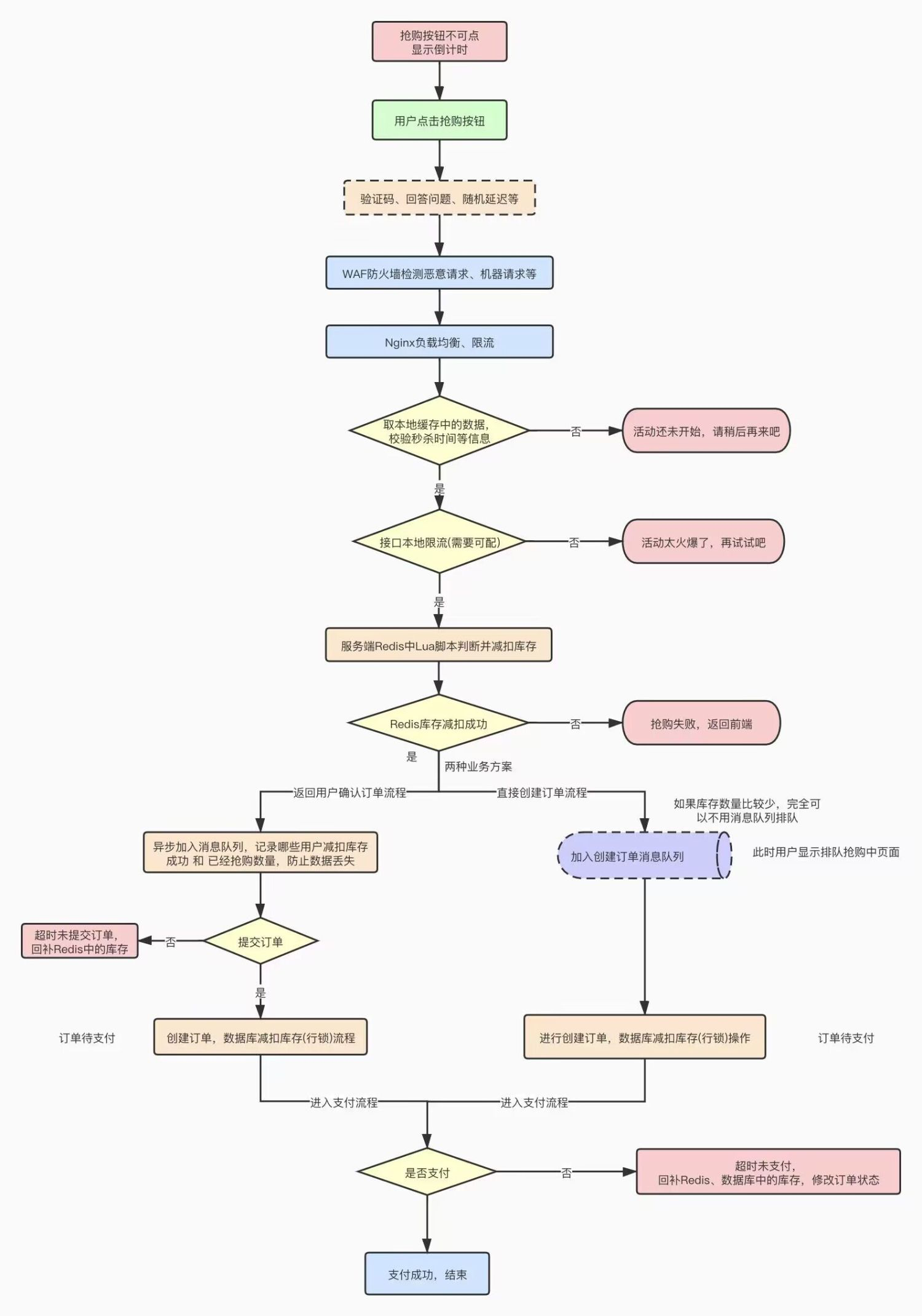 这一两秒会出现一个瞬间峰值,因为是短暂的活动,不能消耗太多服务器资源,所以需要达到最小代价做到最大的抗压,不直接冲垮服务器,还得保证不超卖,不丢单,不宕机等问题